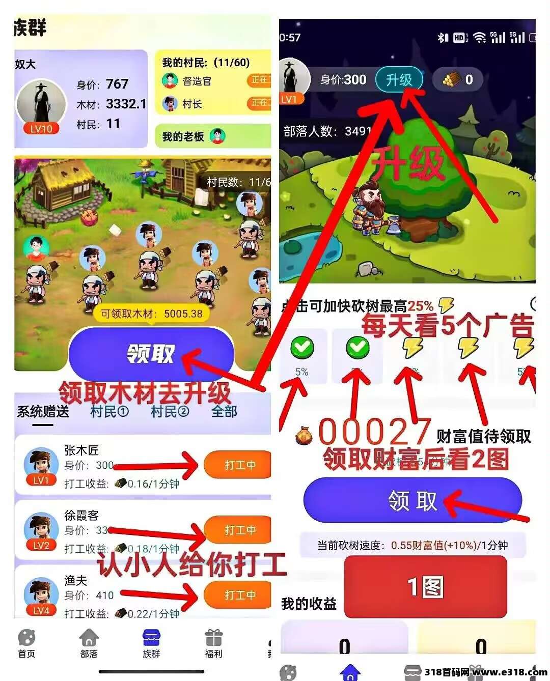 第二步:点击族群页面、雇佣系统赠送的24个工人,先选百级农民去打工,24小时记得上线一次领取木材。