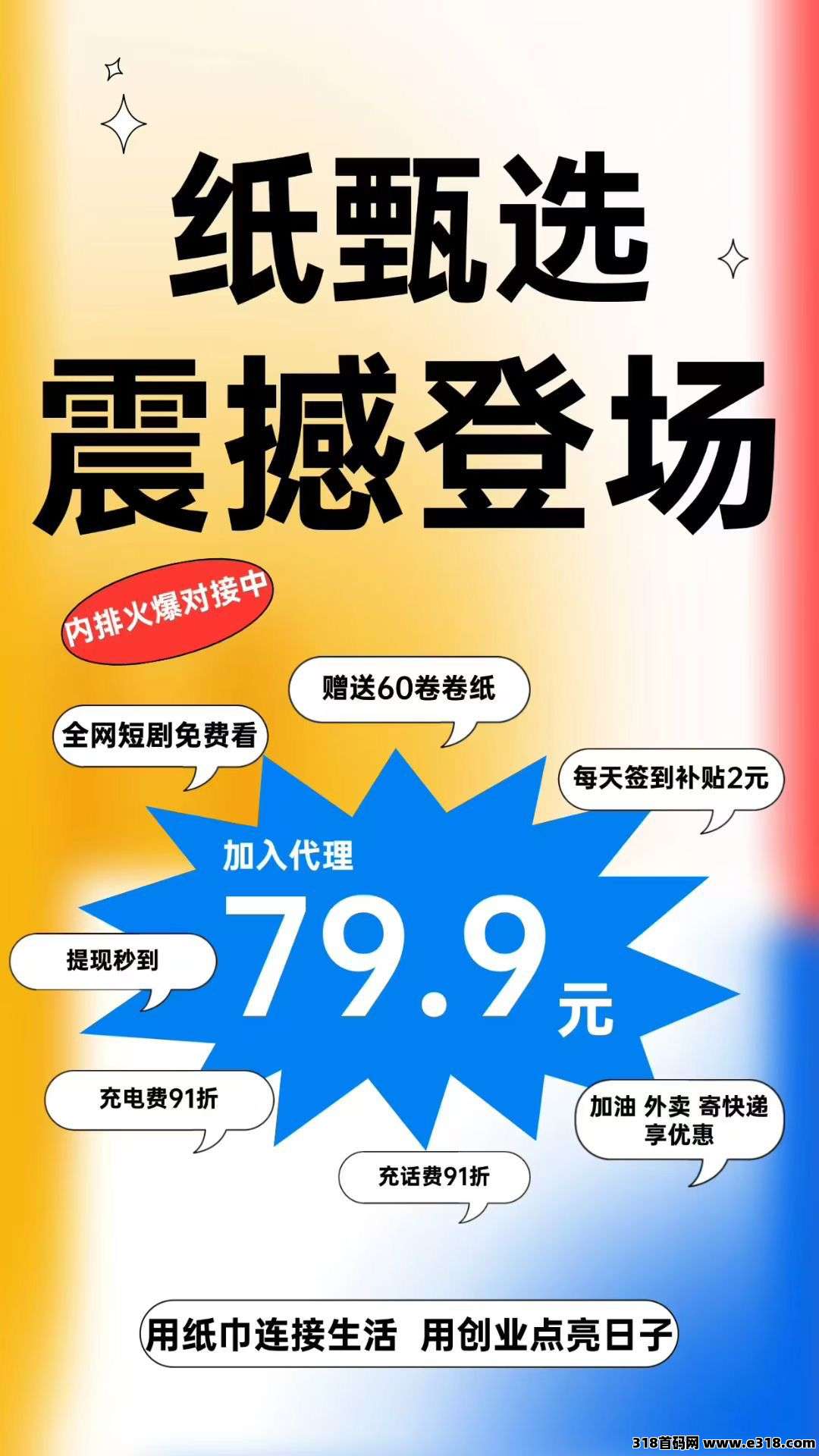 纸甄选是一款结合日常生活需求的创新项目,现正面向全网招募首码代哩,入驻门槛仅需79.9圆。成为代哩后,不仅可以享受丰厚的日常补贴,还可通过推广赚取奖励。加入后,会员可获得60卷纸巾赠品,并每天签到领取2圆补贴,让你的投姿更有保障。