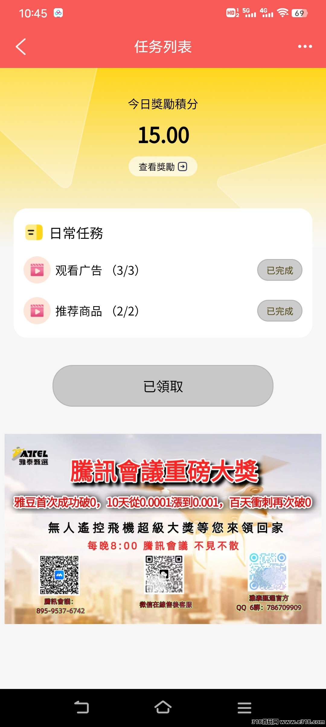 每天三个广告二个浏览任务,只需要1分钟完成,然后领15积分。7天就是105积分。用100积分兑换一个工人。工人每天生产雅豆。