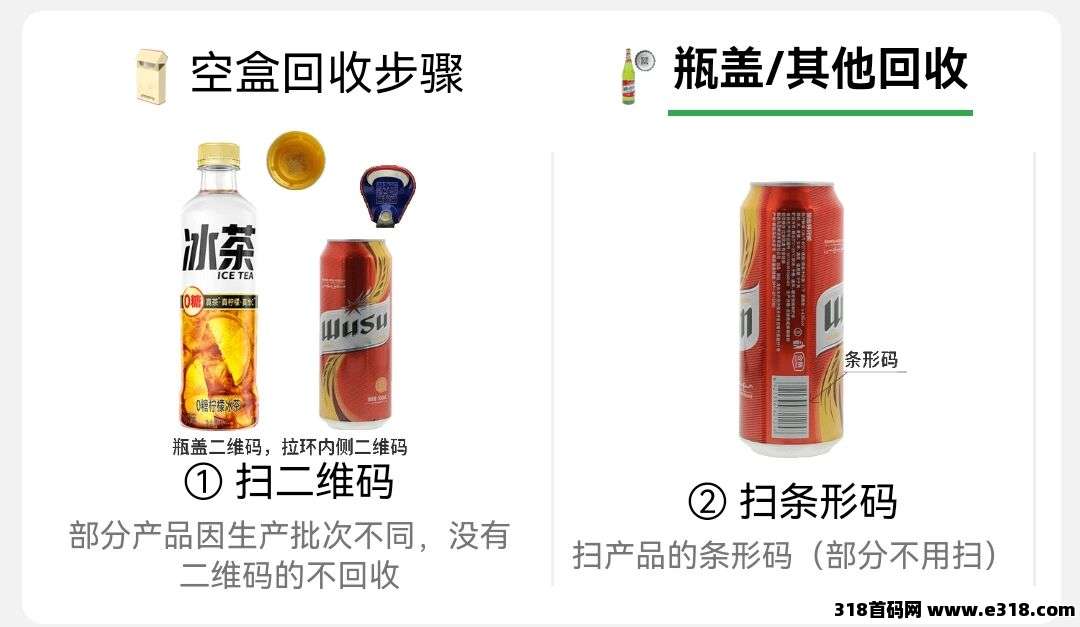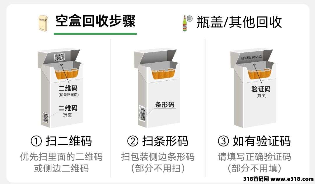 烟盒瓶盖回收 烟盒内都有侧边码和盒子内二维码 就是我们要回收的 瓶子内一般都有二维码 我们也是回收的 简单易懂 平均几秒就可以扫码完成