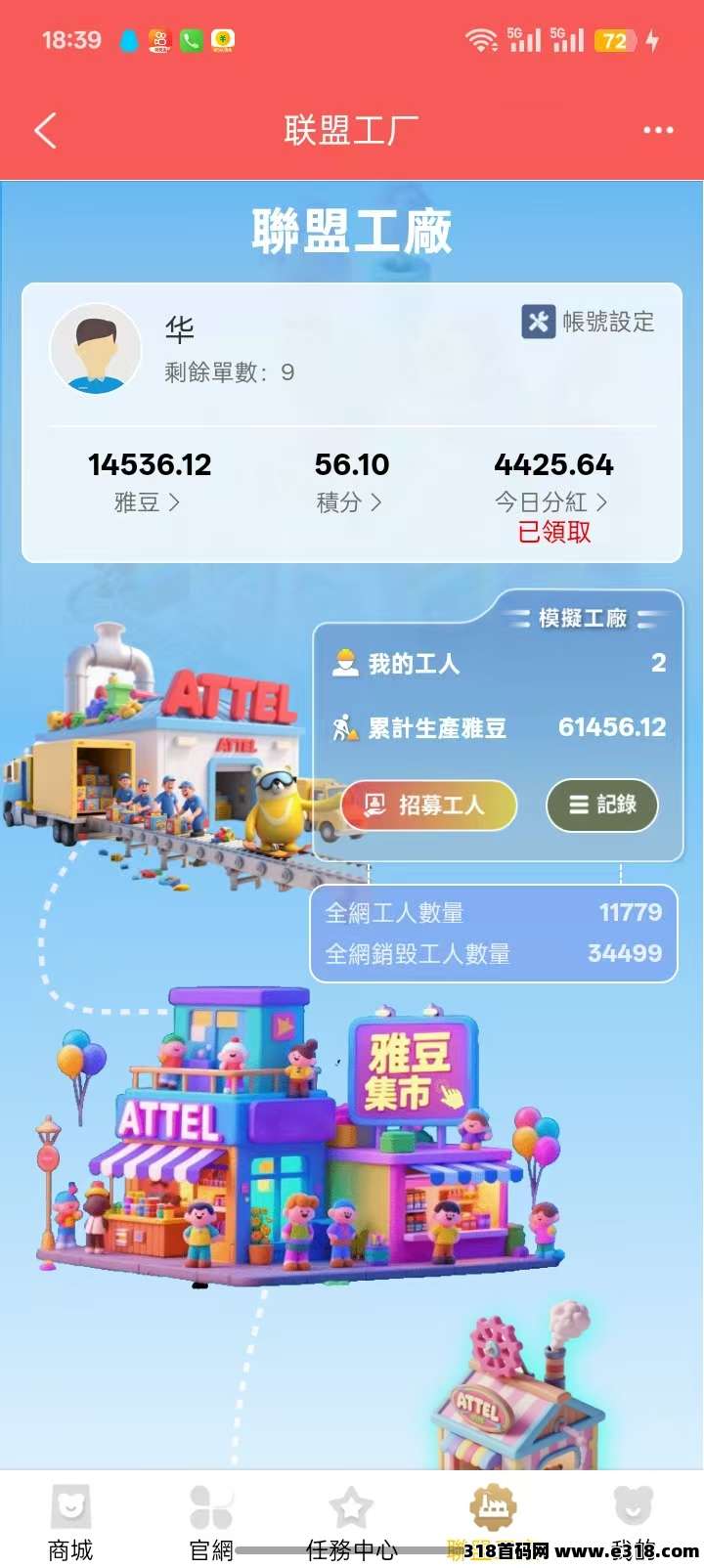 首码雅泰甄选,0撸,用户每日通过完成简单任务获得15积分,满100积分可兑换一个工人,全网满1万工人开始产雅豆