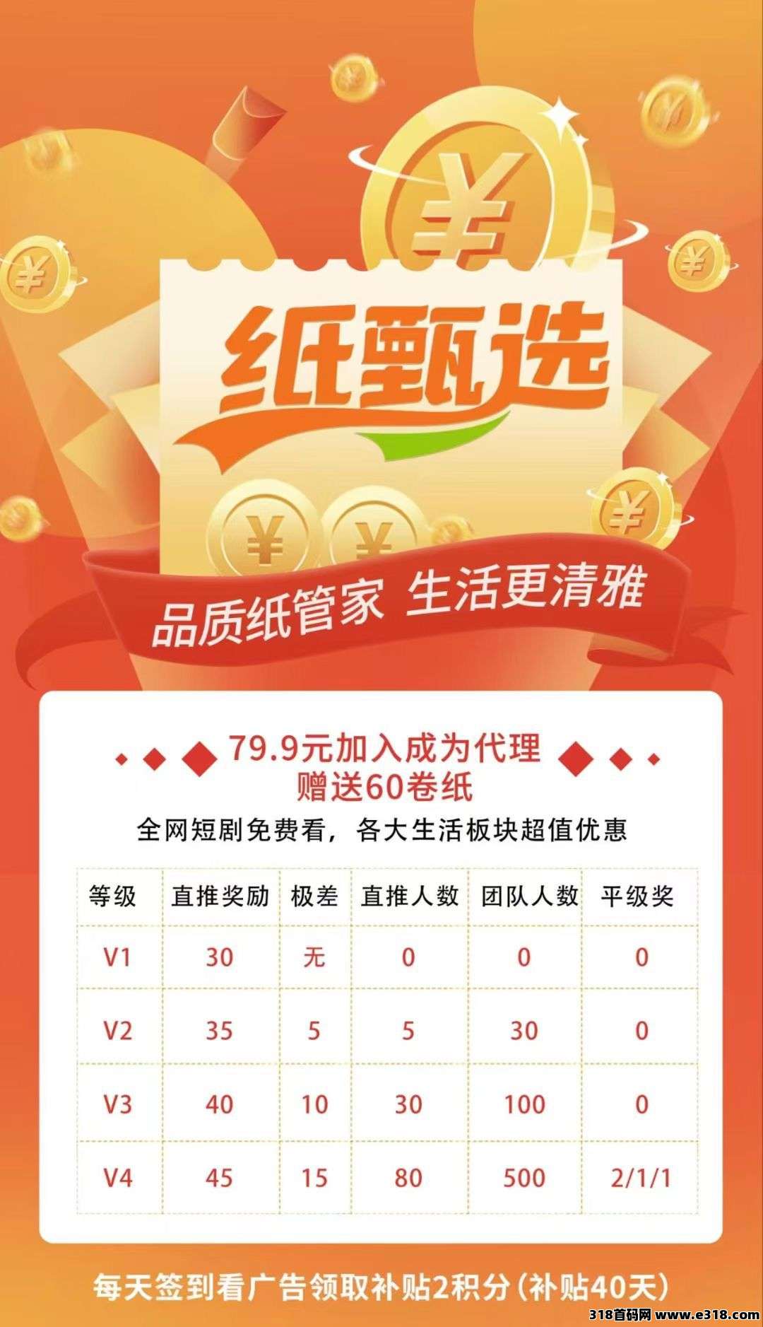 加入《纸甄选》只需79.9圆,就能成为代哩,享受包邮赠送60卷卷纸的福利。每天签到还可领取2圆补贴,轻松积累收入。此外,平台还为用户提供了全网爆款短剧免费观看、话费和充电费优惠等福利,极大地提升了用户的参与感和收溢潜力。
