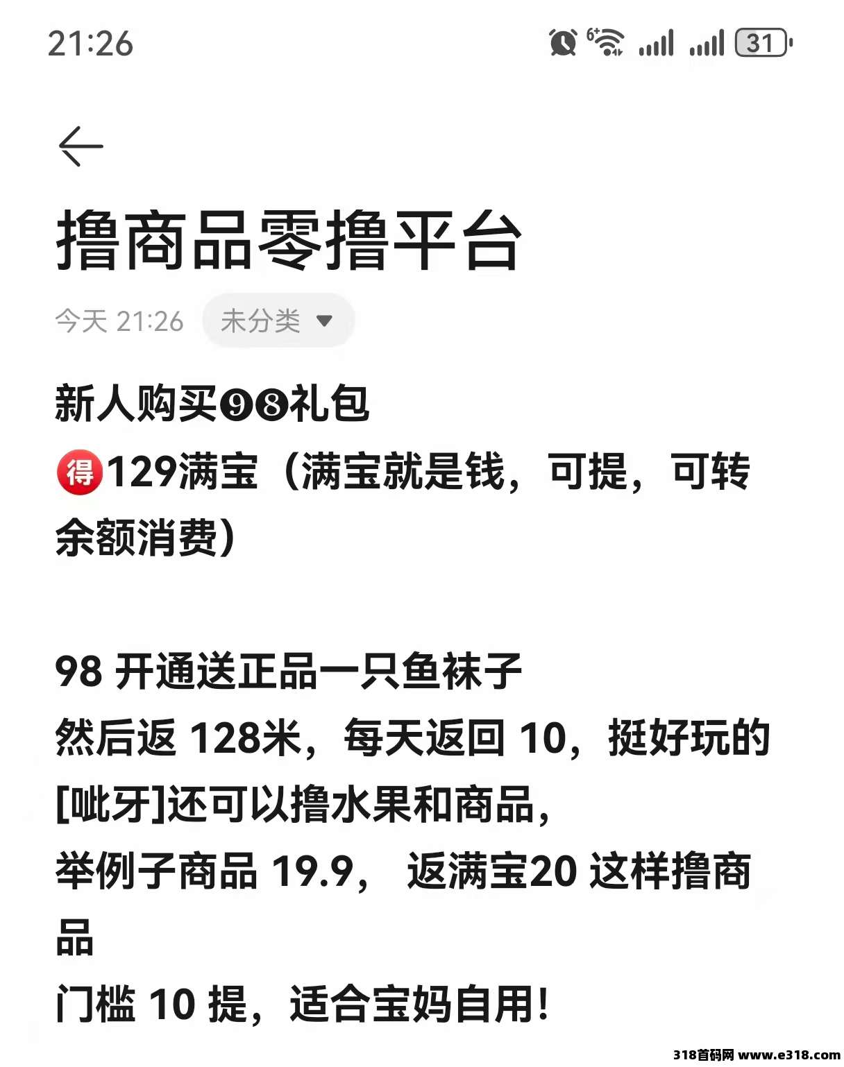 二、操作步骤:新人购买98礼包送正品七双一只鱼袜子然后返 128米,每天返回 9.8左右