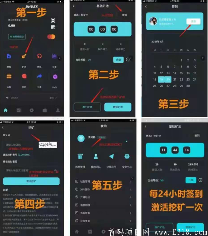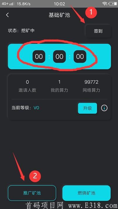 2、每日签到,以及启动挖kuang:点左下角--矿池进入。1️⃣右上角进入签到;2️⃣左下角推广矿池进入激活挖kuang,密码123456