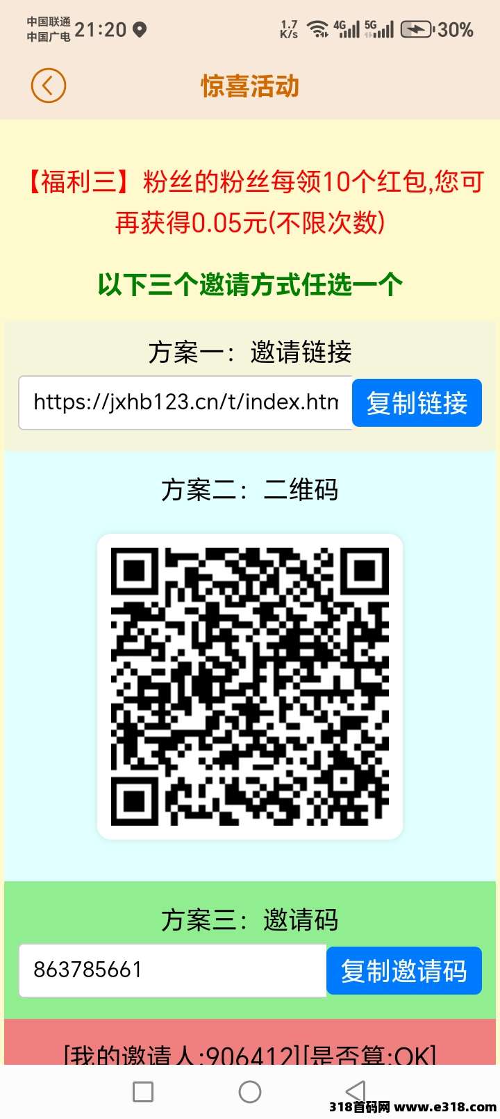 惊喜红包 一个红包固定0.1 不设限制,多手机可以多号操作,每天半个小时 赚3-5元, 真实靠谱,不虚假宣传。每天轻轻松松赚赚一瓶水钱多了没有,现在赚钱也挺难的,好项目很难找,这算是一个长久的吧,我玩了几天。 看得上每天赚35块的可以了解一下看看,就当我没说。。