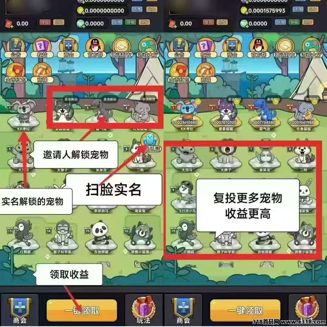 邀请实名用户注册,解锁宠物,每日产出最高0.6金币。邀请越多,产出越多,收益倍增。
