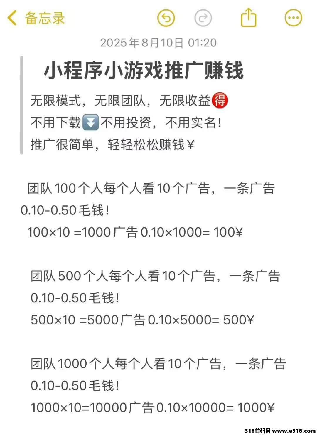 [游辰]广告赚,保底收益高,最新模式,全新微小游广告首款团长模式0撸 类似尊牛友梦联盟,100米起提
