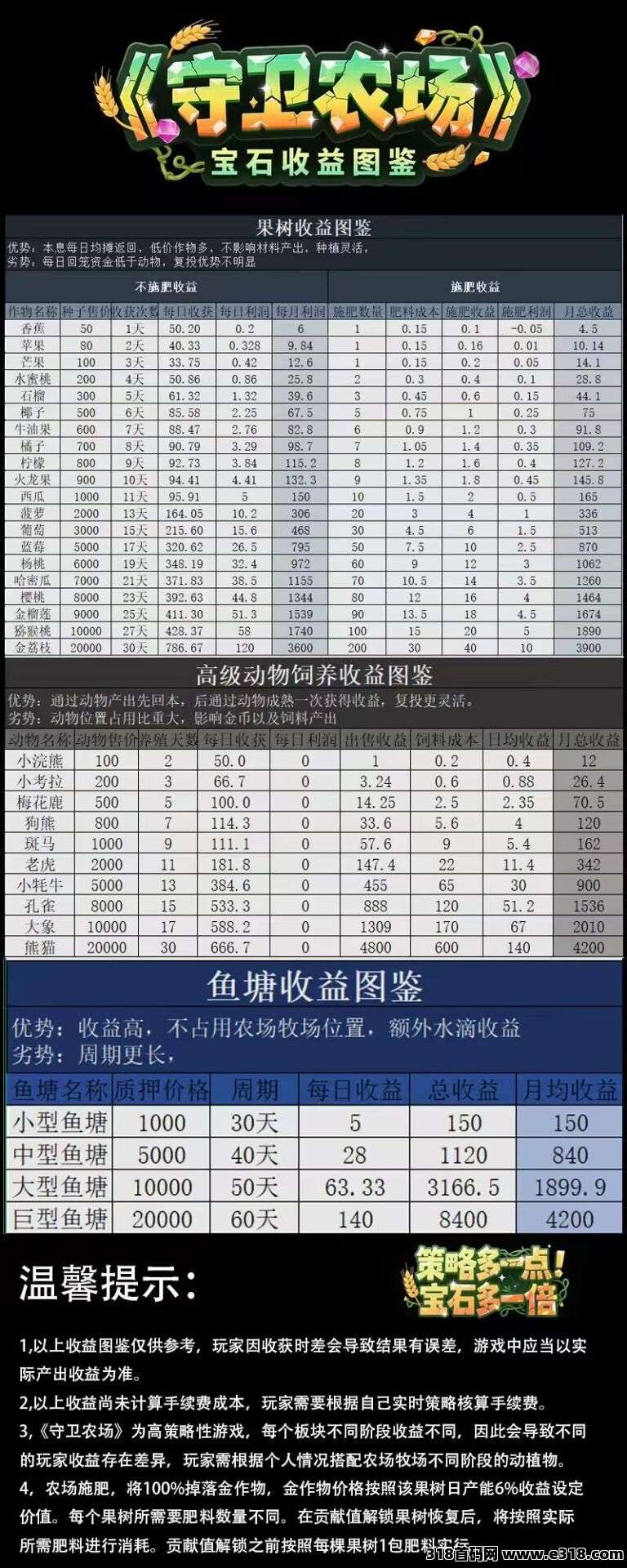 体验田园生活,边玩边赚!农场、牧场、花园,果园,鱼塘…成熟的作物和动物产出各种材料和金b,加工厂加工赚钱 。平/台保底回收。