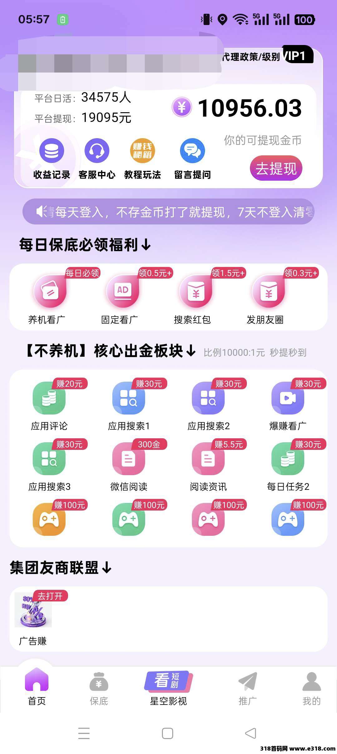 星空赚动,零撸保底,广告赚,搜索赚,团队模式,三十大板块收益,免费短剧娱乐,等众多网赚,全网最全业务赚钱平台