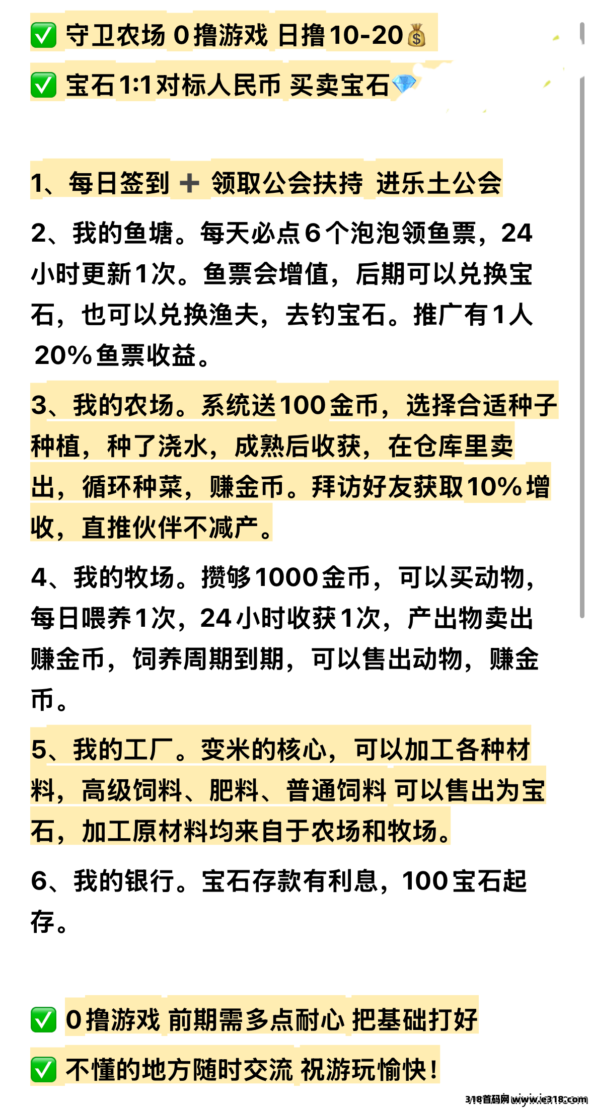 体验田园生活,边玩边赚!农场、牧场、花园,果园,鱼塘…成熟的作物和动物产出各种材料和金b,加工厂加工赚钱 。平/台保底回收。