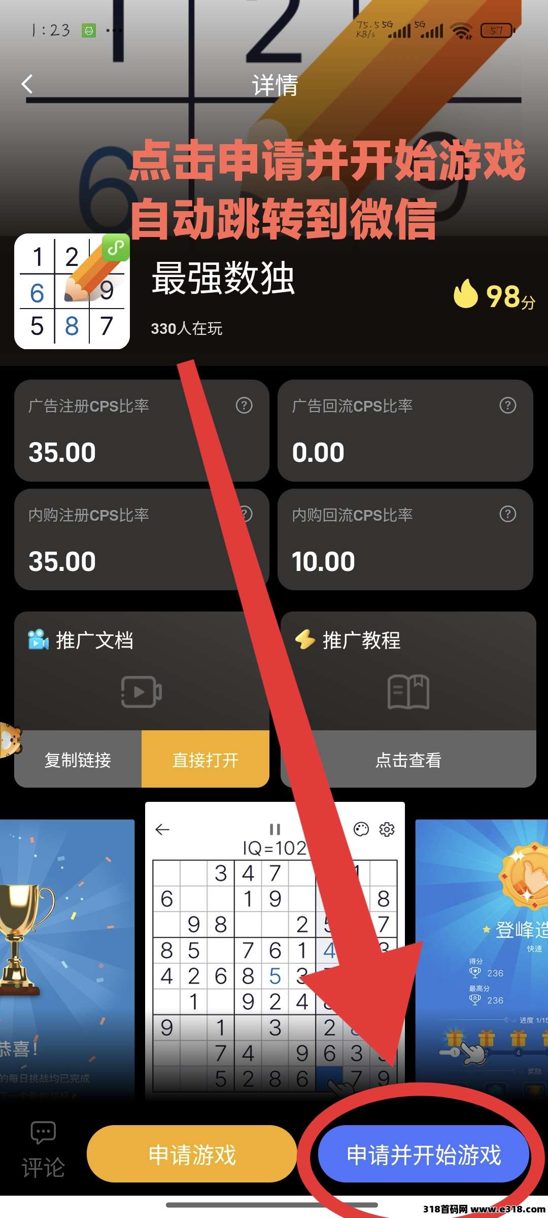 重点:一个号一天只能玩10个游戏,一个游戏看5-8个广告,在这5-8个广告选择两三个个广告内转就可以了,其他的广告播放完,点进去浏览一会退出就行多点几下这样佣金高,