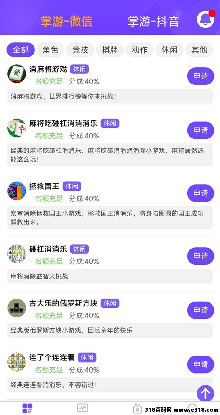 这里我们可以选择自己感兴趣的游戏进行申请,掌游推广助手邀请码是cps520155,不过最好选择分成百分之四十的,这样收益才最大化。然后点击右下角“我的”,找到“我的推广链接”。