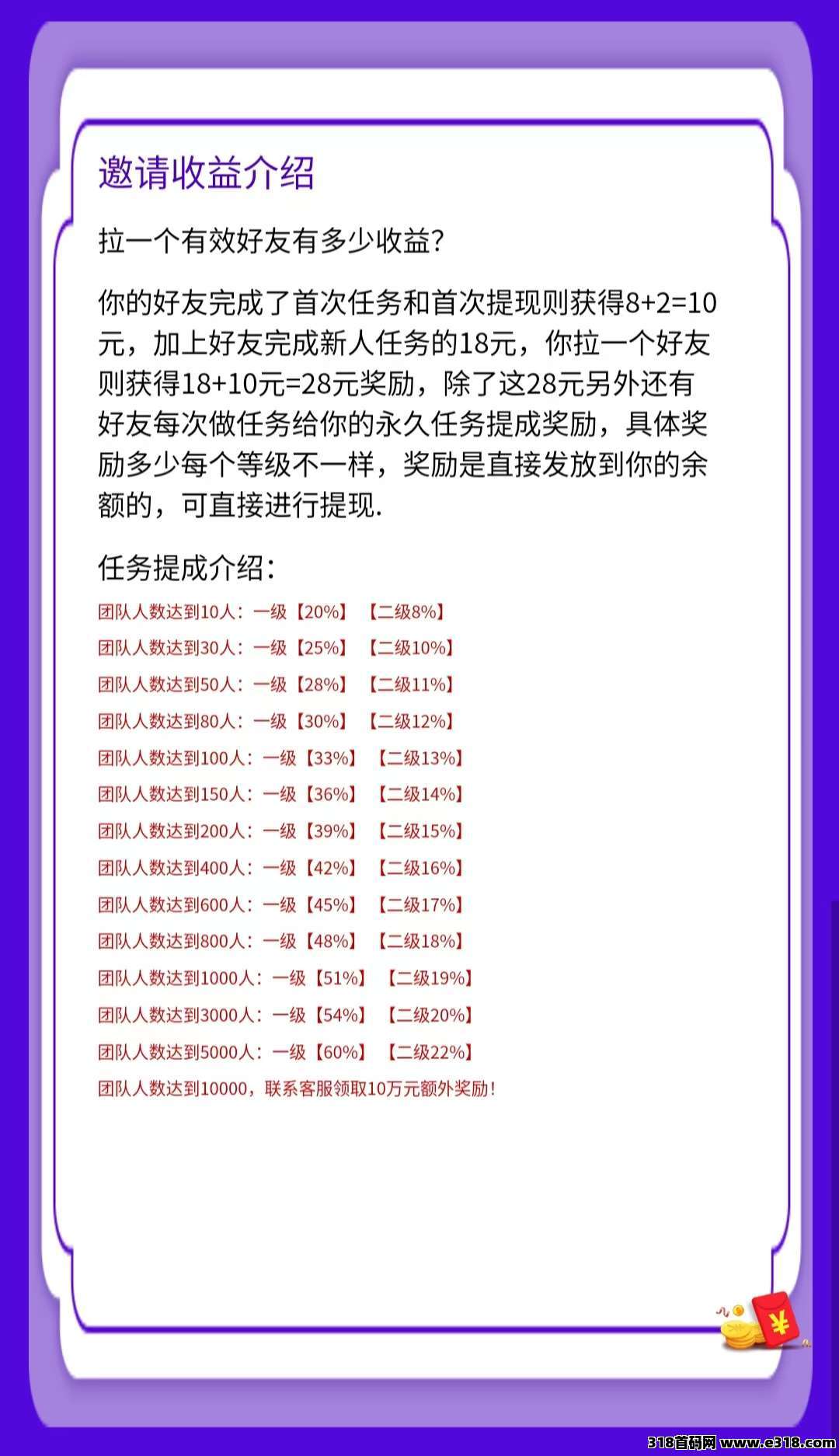 1,一级好友首次做任务奖励你8元,二级好友首次做任务奖励你2元。