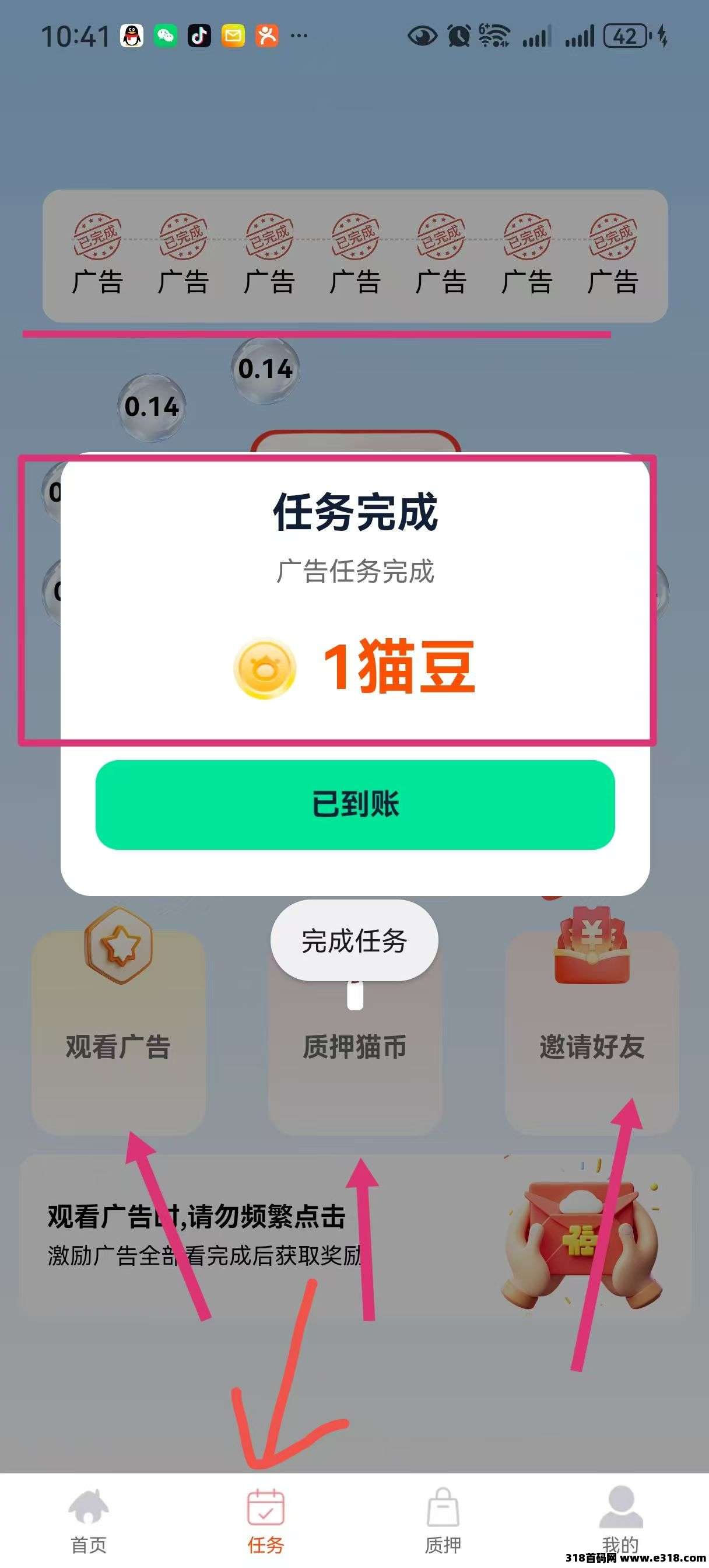 招财猫招财猫:每天7个广告获得1个猫B=1米,每天坚持看!每天坚持赚!