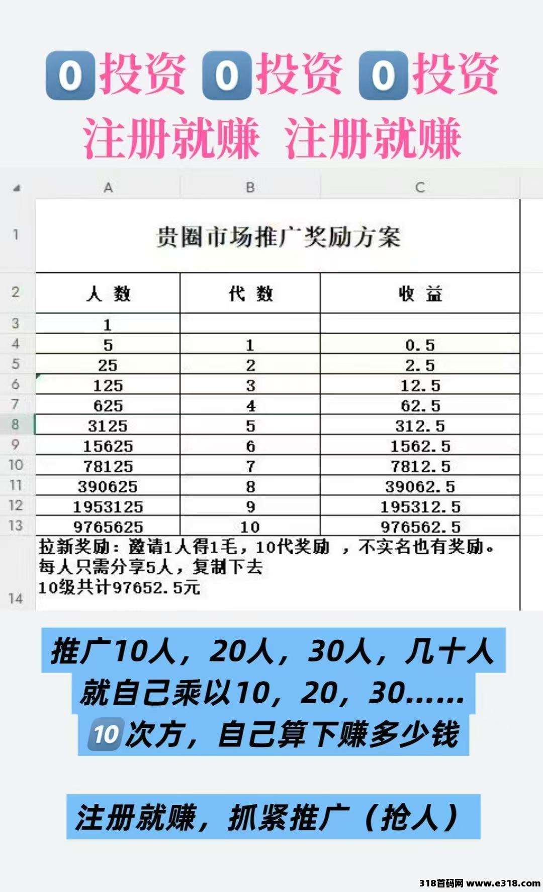 按每层推广10人算,每一层乘以10的十次方,收入个亿每个人推广能力不同,多劳多得……收入无限大?不封顶