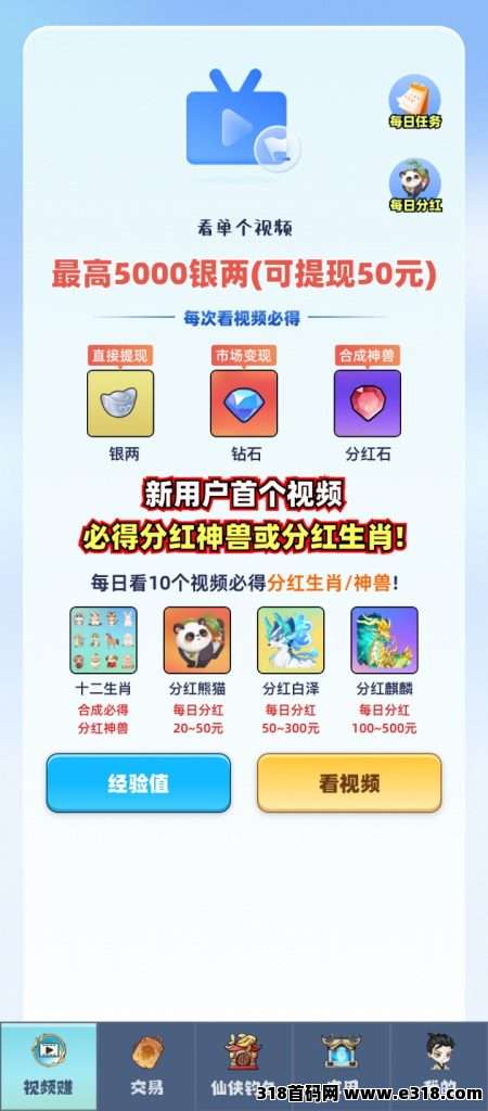 广告收益增加保底,提现秒到账,一级货币银两提现秒到账,二级货币钻石官方0.3提现兜底,市场价在1元左右,看广告可以大量赚米,每天上限100条,看广告可获得银两+钻石+石的收益,银两可直接提现!钻石通过市场换银两或找官方换银两提现。钻石可以开出生肖或者神兽每日分元宝,打Boss直接分米10个Boss奖池,奖池每日注入,昨天广告收益10%。凭伤害占比瓜分奖池银两,提现秒到账!