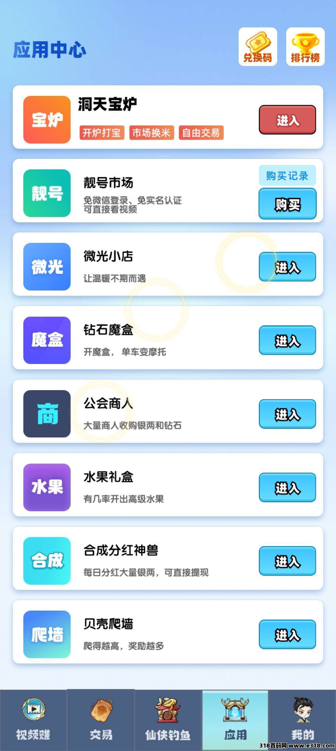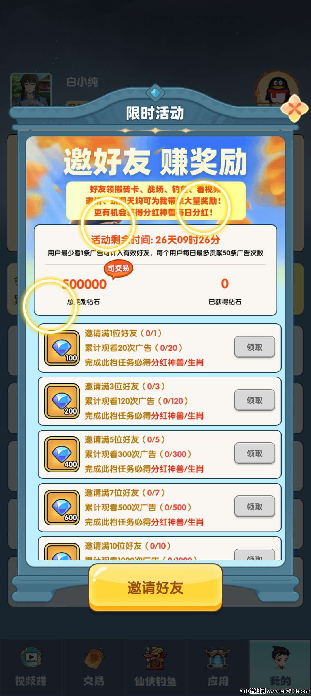 仙侠时代零撸,微光盒子二台,保底收益高,团队模式,邀请日入百米,注册送98搬砖卡,每日看100个广告得银两+钻石+石奖励,切换不同APP,邀请好友激活98搬砖卡,奖励增加100%,石随机兑换十二生肖或神兽,集齐十二生肖可兑换神兽。