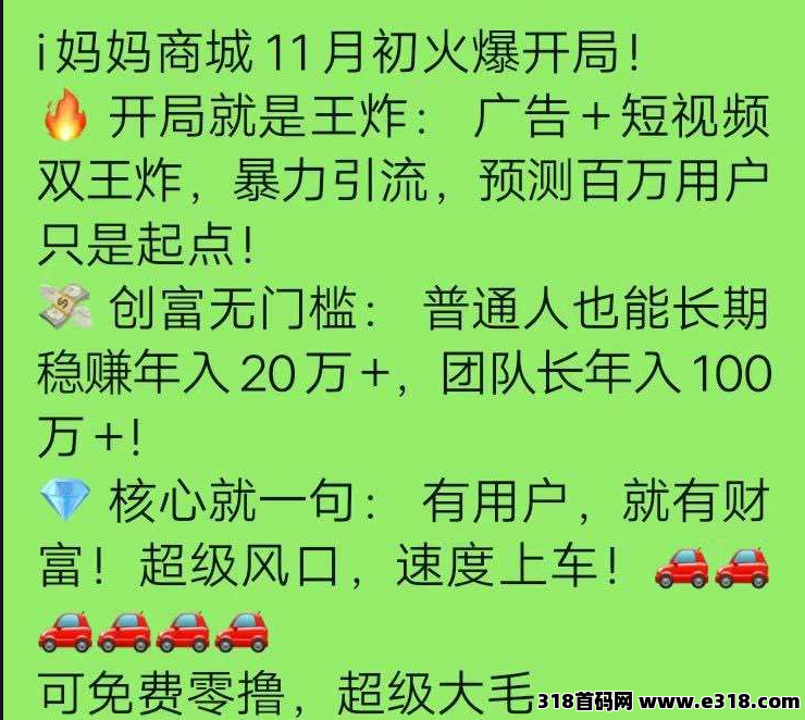 i妈妈商城首码刚刚上线,是一款集广告、商城消费与团队裂变于一体的创新型平台。用户无需投入任何费用,只需完成简単操作,就能解锁多层收溢体系,实现每天轻松赚取四位数的目标。平台采用全新的点位永动模式,全球首创,通过激活占位即可享受团队裂变与推广红利,真正做到零投入,高回报。