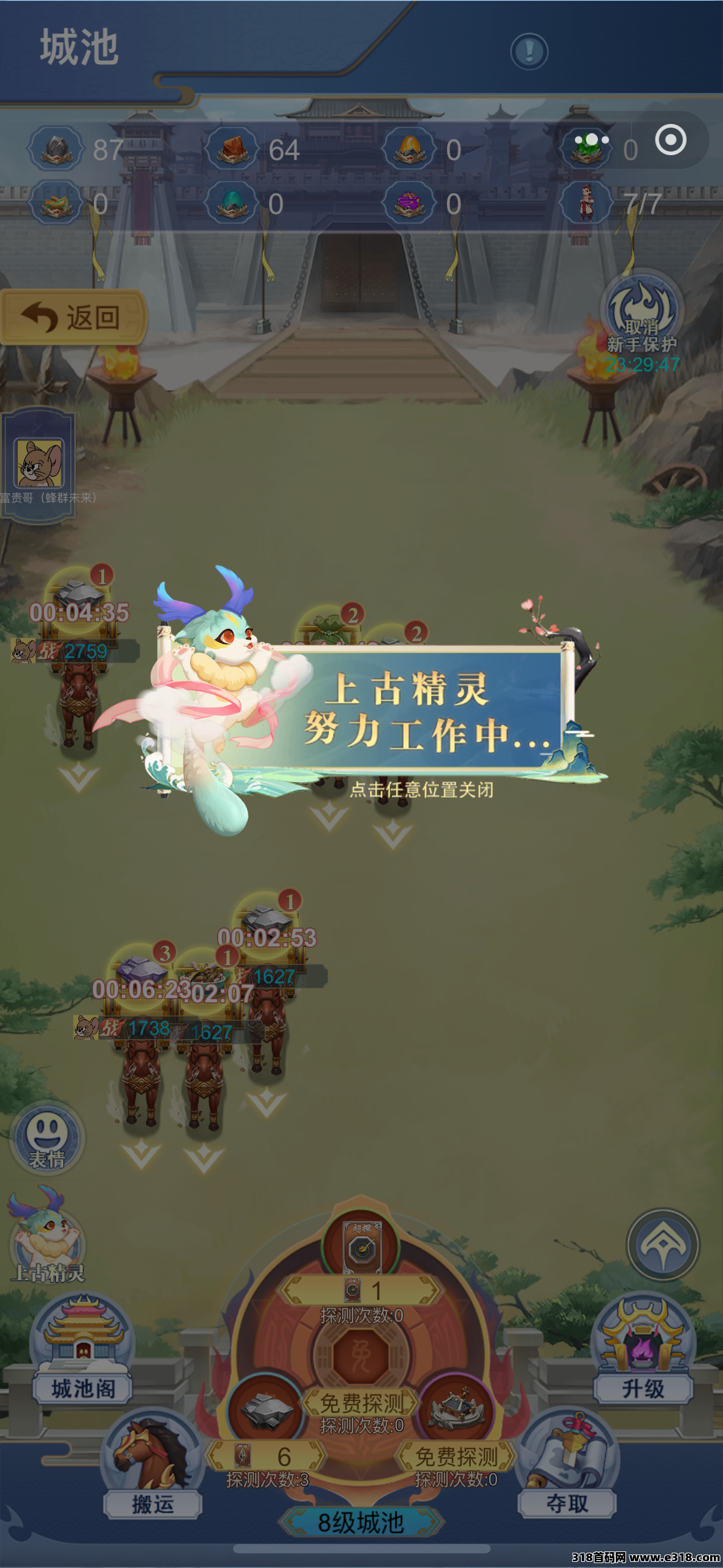 进入城池界面:左下角,有上古精灵,设置好每一个资源派遣一个武将,每天看1个广告即可激活助手,释放双手,很节约时间。上古精灵可以一键派遣英雄拉取资源。