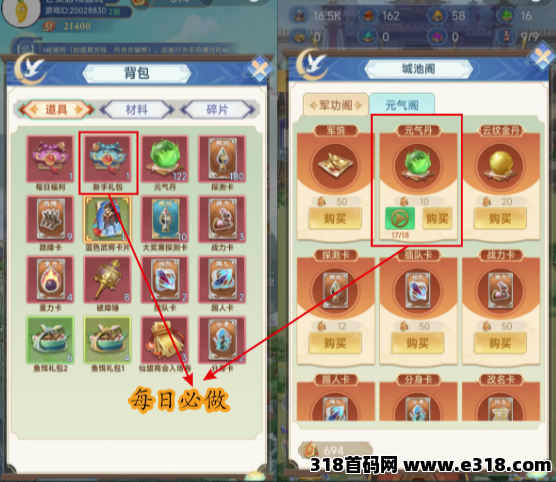每天签到的礼包也领取上,点击背包使用新手礼包,获取武将!