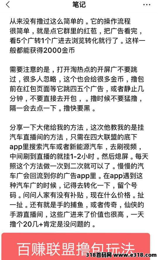 首码〖百赚联盟〗零撸广告赚,不养机保底收益高,放水中,单机每天10-50+,免费送不养机玩法教程,扶持拉满,待遇置顶,团队、个人都有奖励!