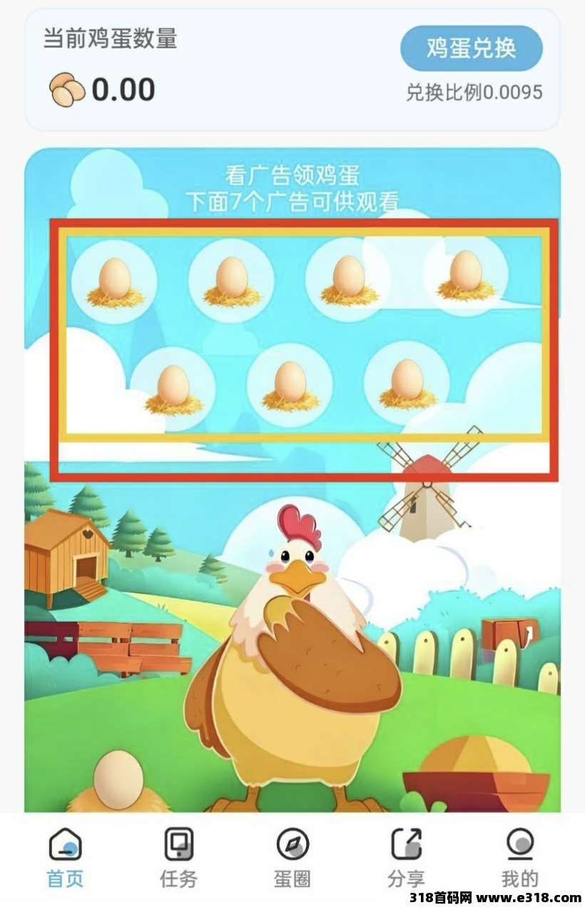 零撸一个蛋蛋,白嫖无成本,玩家每日观看7个广告获得鸡蛋收益大概1元钱,鸡蛋随着价值每天上涨一天也可能赚好几块钱,最低0.1米起提。
