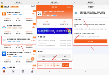 打开蜂小推这个迅雷官方合作平台,用手机号注册账号并完成实名认证(用于后期佣金提现),进入“搜索推广”板块,找到“迅雷浏览器”项目,进行口令申请,选择“书签口令”或“站点口令”,很快就能拿到专属拉新口令。生成后口令后就可以开始推广。