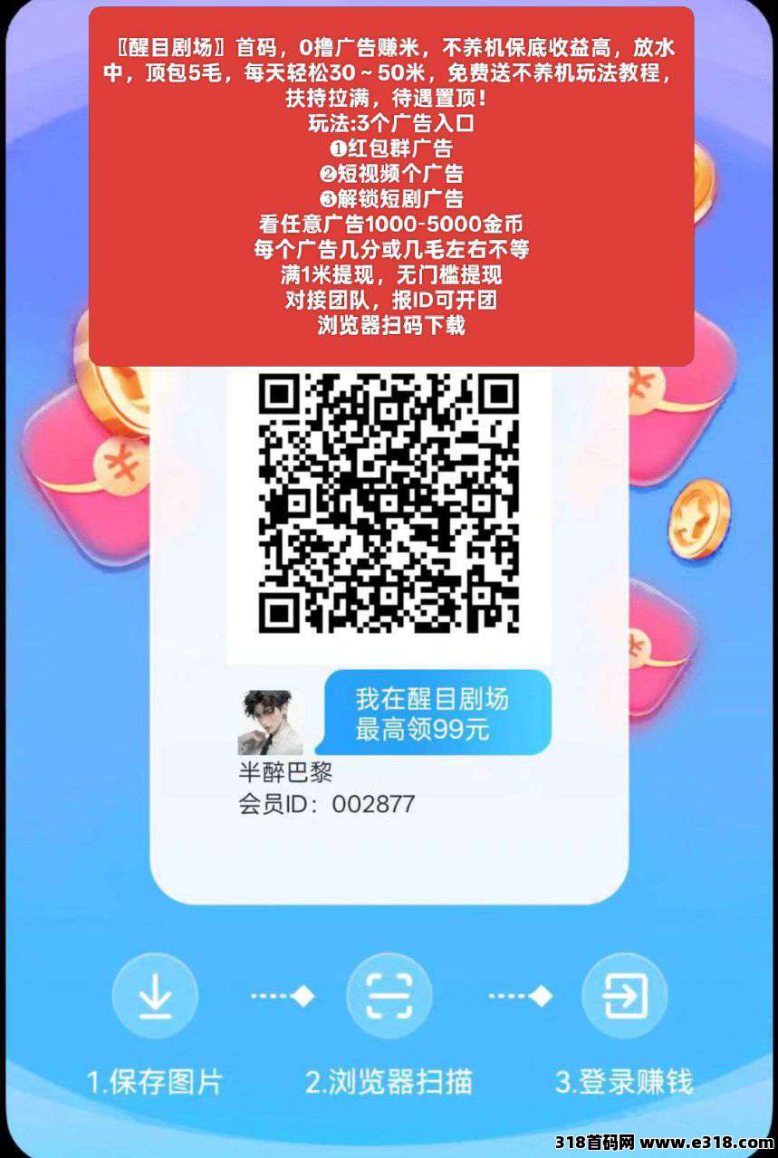 〖醒目剧场〗首码,0撸广告赚米,可全自动挂机,不养机保底收益高,放水中,顶包5毛,每天轻松30~50米,免费送不养机玩法教程,扶持拉满,待遇置顶!