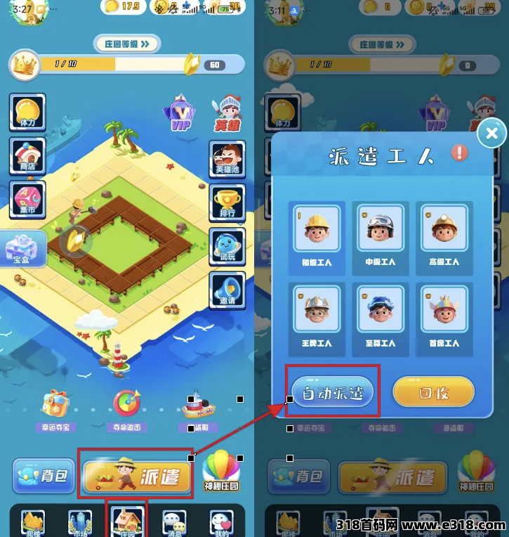 接下来点击庄园-派遣-自动派遣把工人派到生产线上开始工作友情提示:看不到派遣,下划一下屏幕即可