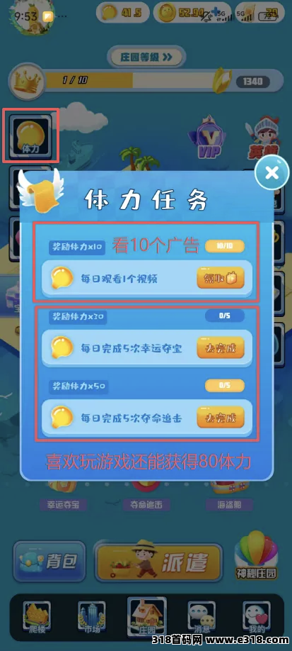 接下来就是点击体力按钮把每天的10个广告看了,可以获得100体力喜欢玩小游戏的,还能获得80体力