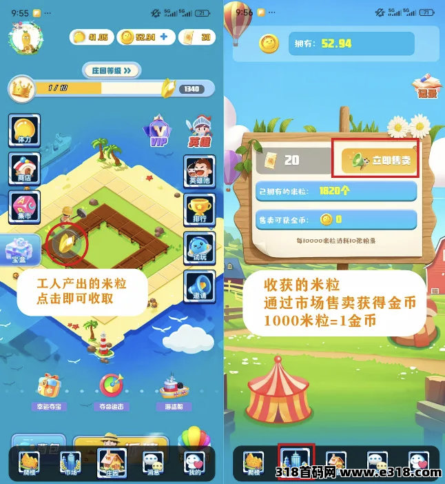 工人打工产出的米粒,点击即可收取收获的米粒通过市场变成金币1000米粒=1金币