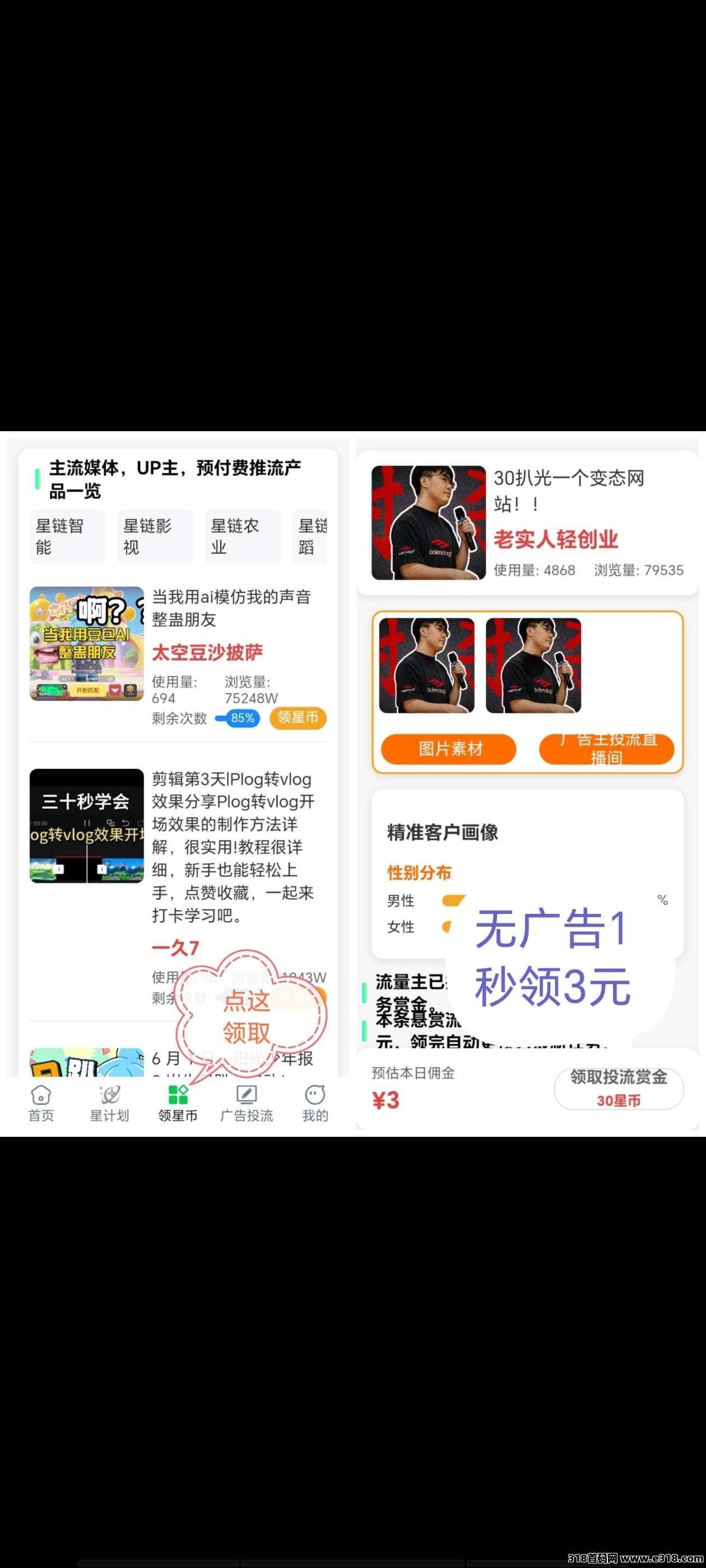 每日3米,可以零撸,不实名,没广告,每天进去1秒领30星币=3米,体验玩家100米起提,会员10米起提,星币可阶梯**,直推10%,间推5%收益
