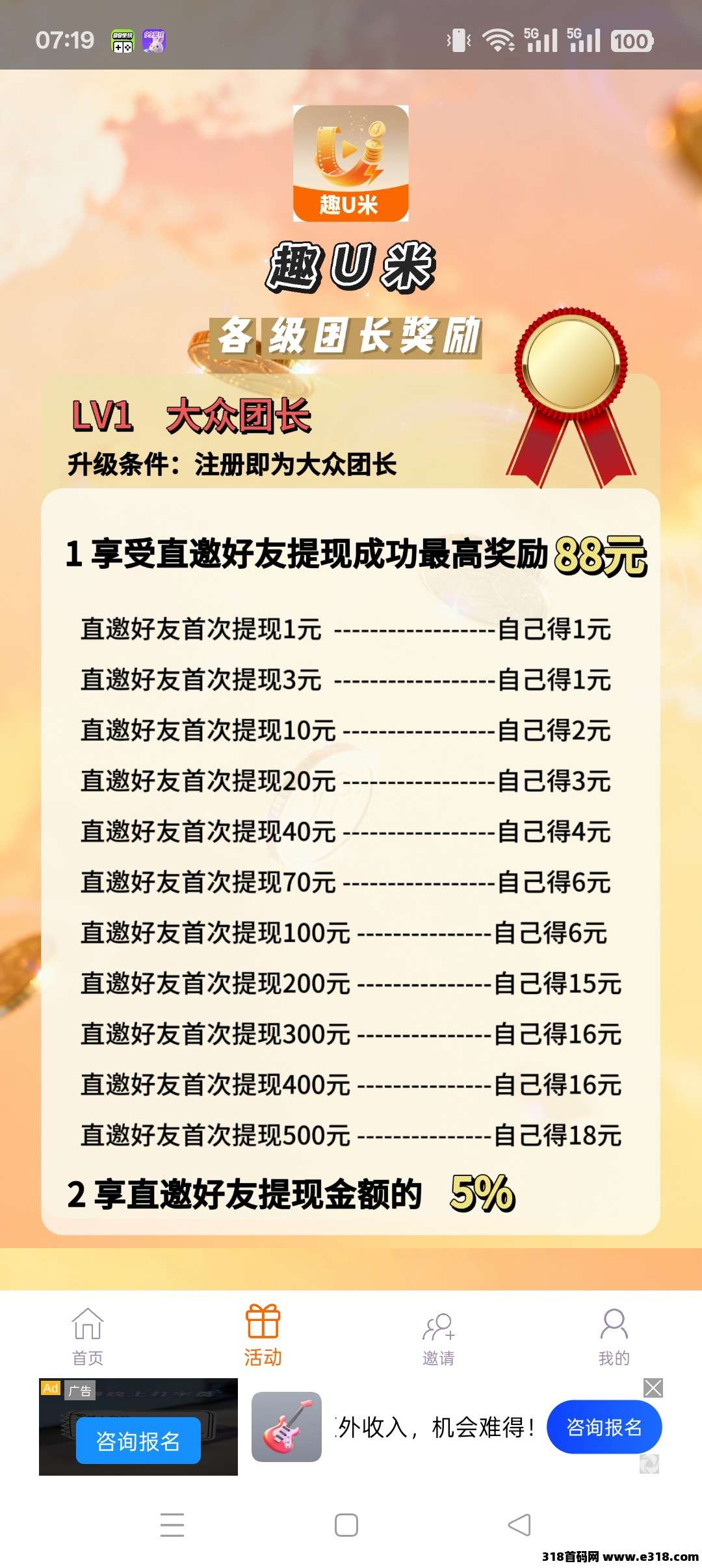 〖趣U米〗零撸广告赚,保底收益高团队模式,单机每天10-30+,邀请日入百米