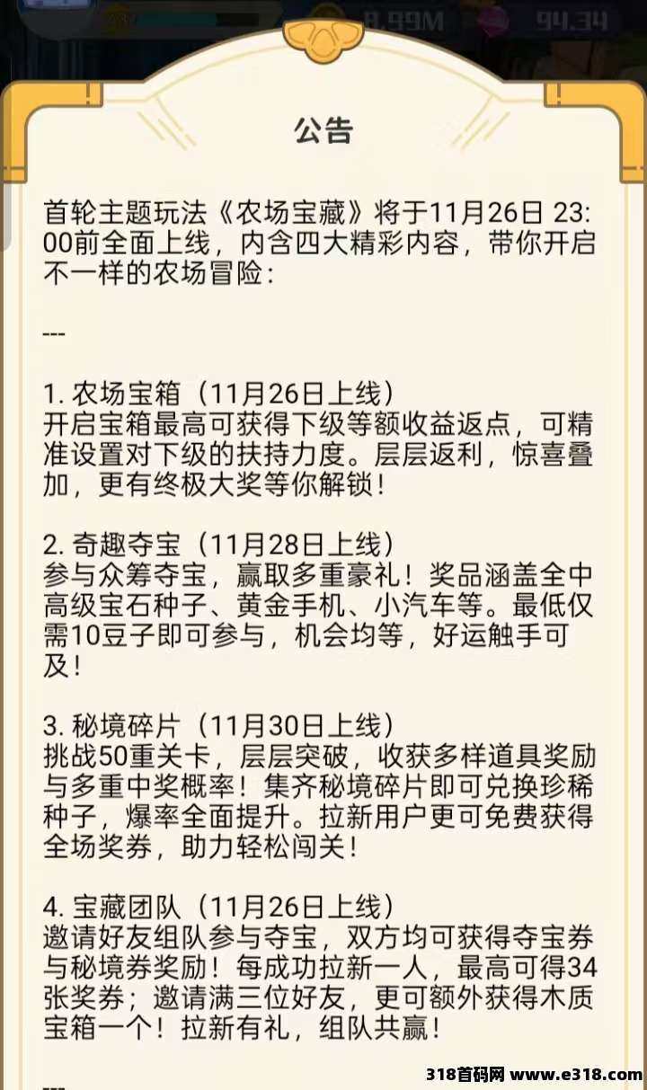 农场宝藏全面上线,宝箱+夺宝+秘境三大玩法阶段性释放,早入局利润拉满