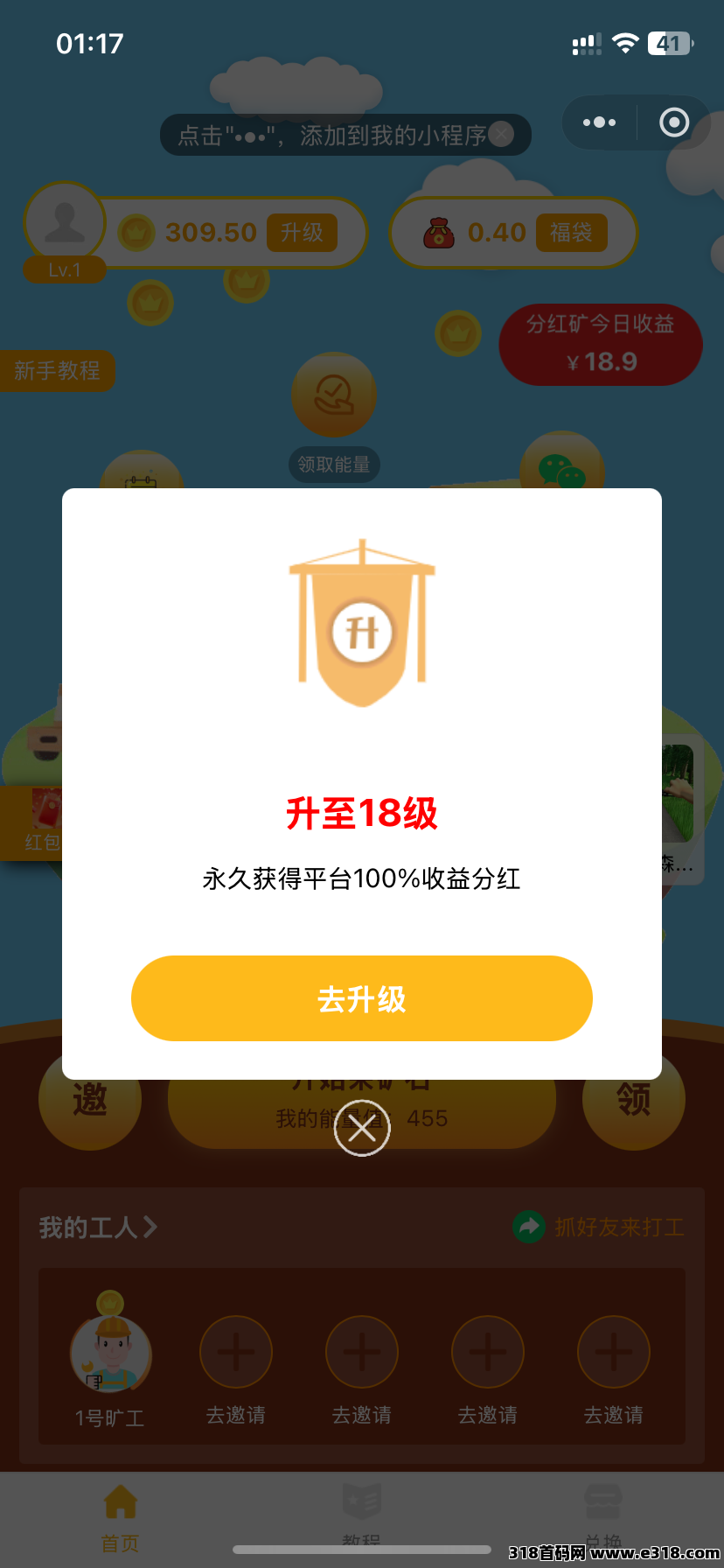 上限100个广告,180能量激活3小时产10800矿石,1万矿石兑换1个金币,188金币兑换1米红包,消耗矿工升到18级后可得平台**
