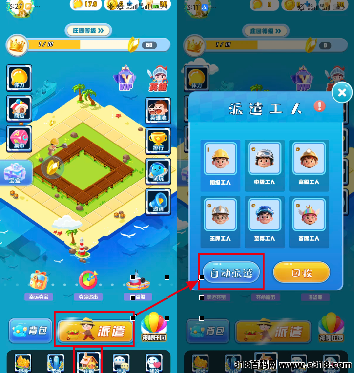 进入 “庄园 - 派遣 - 自动派遣”,让工人自动开工;