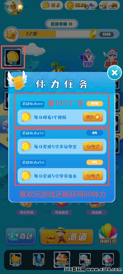 看广告:1 个广告 = 10 体力,每天最多 10 个,轻松赚 100 体力;
