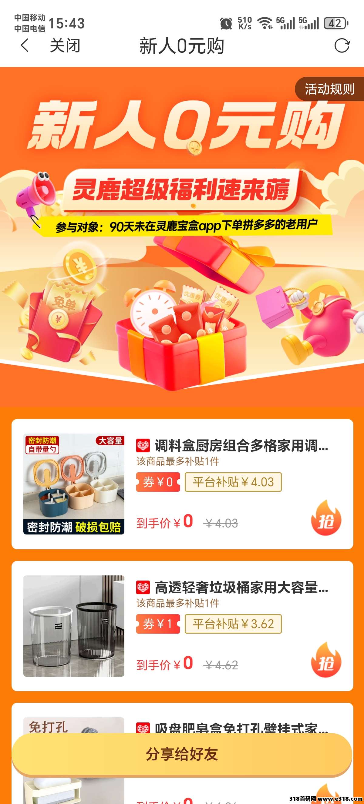 下载完app后,打开登录,到首页,点击“新人0元购”免费薅一款商品!!!