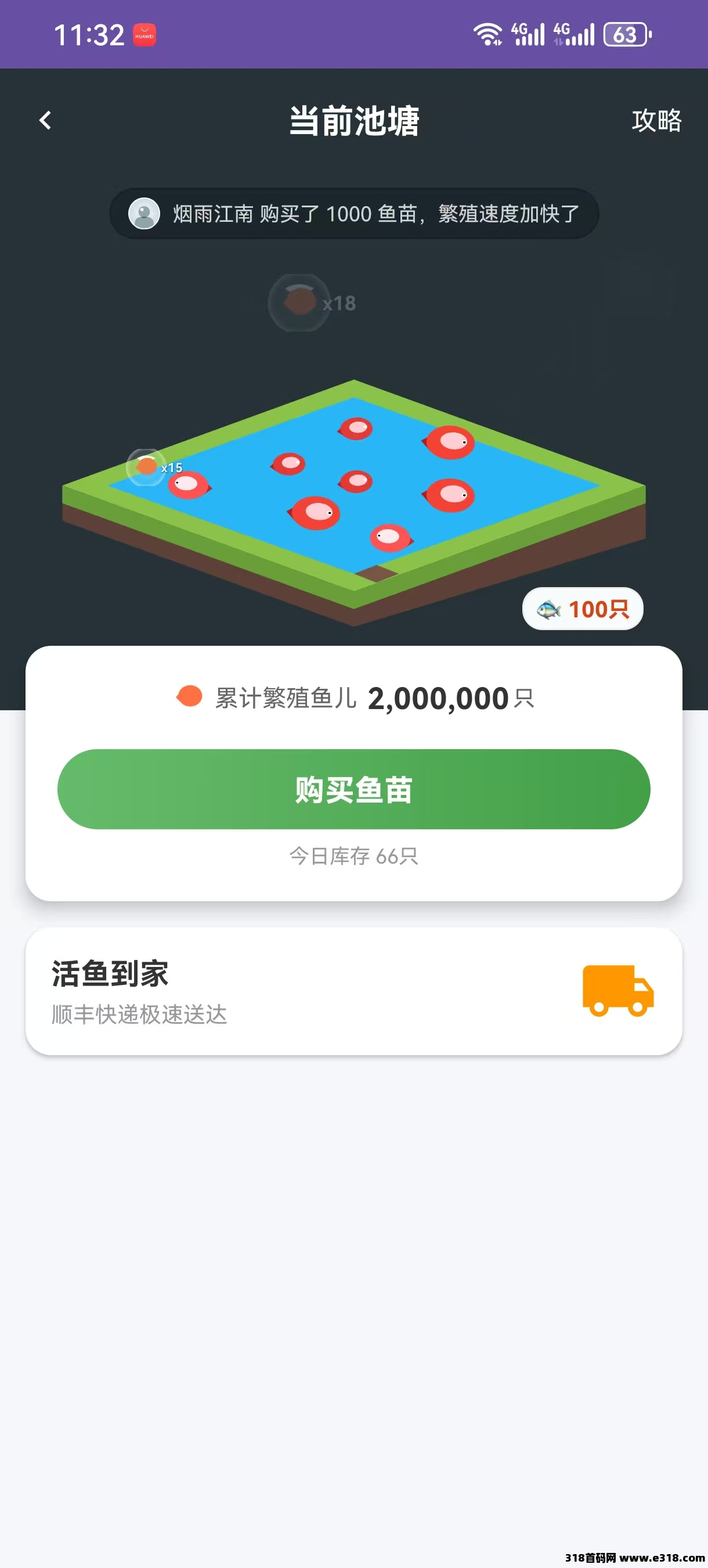 池塘鱼儿越多,每日产出的鱼儿数量也会同步增加;还能解锁 “活鱼到家” 福利(顺丰配送实物鱼)