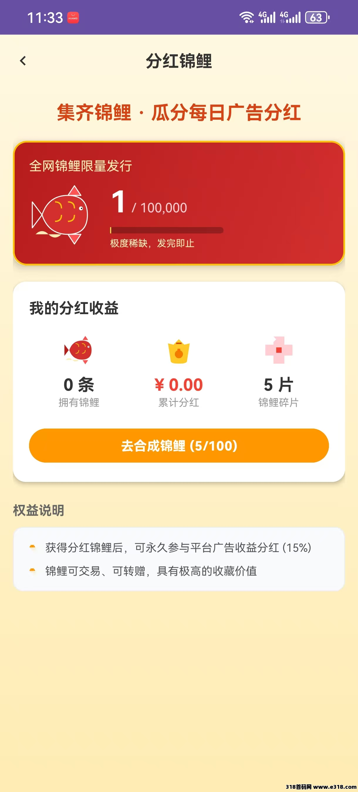 合成后每天自动参与平台 15% 的广告收益**,锦鲤还支持交易、转赠,相当于 “长期饭票”