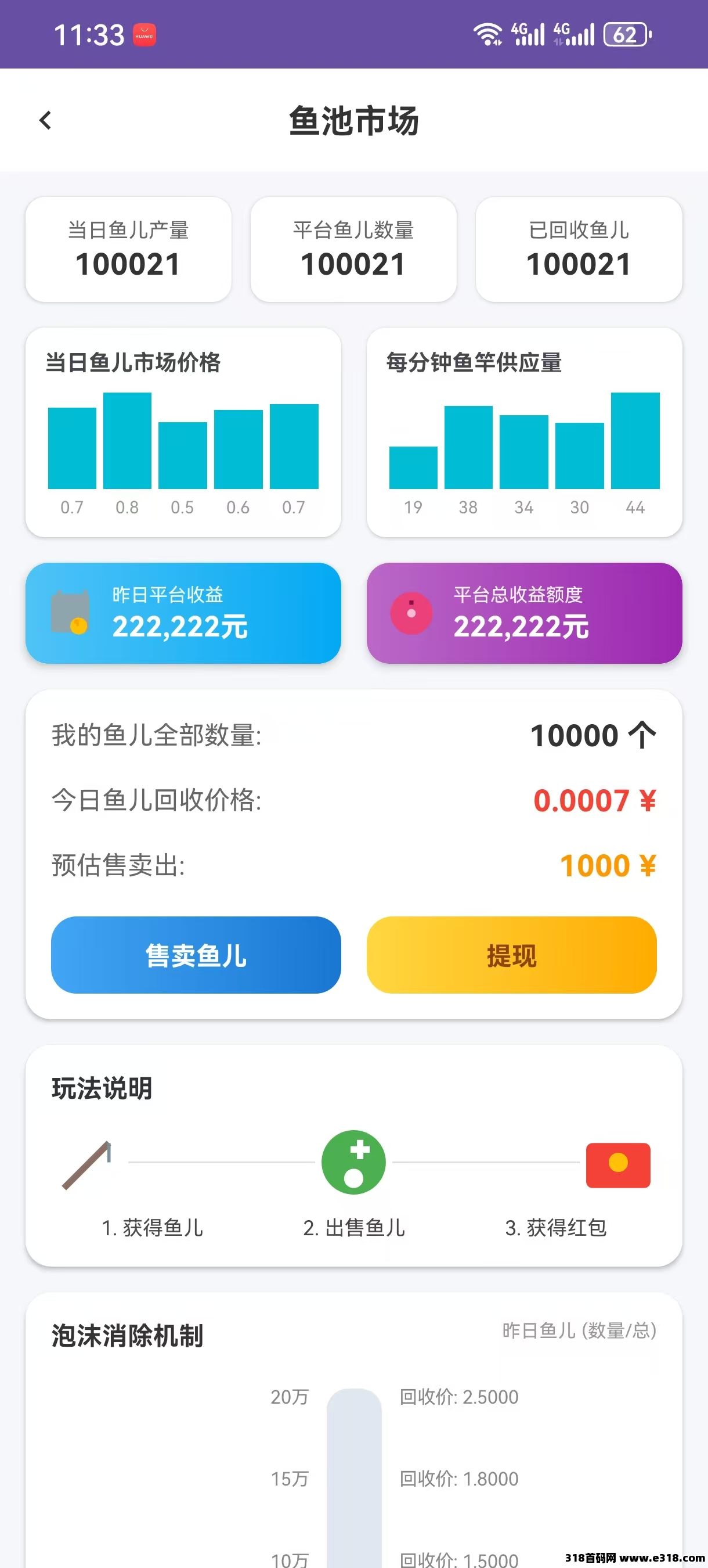 售卖鱼儿:点击 “售卖鱼儿” 按钮,把账户里的鱼儿兑换成平台余额