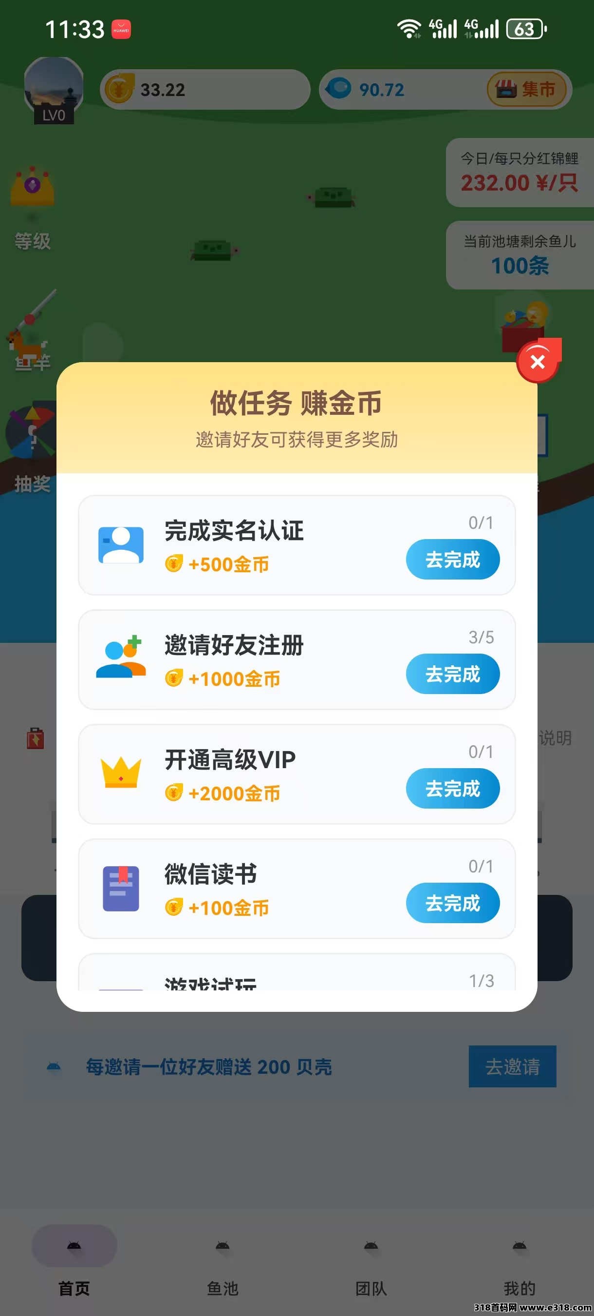 做任务赚金币:点击首页 “任务” 按钮,完成实名认证(+500 金币)、邀请好友注册(+1000 金币 / 5 人)等任务,金币用来买更多鱼竿