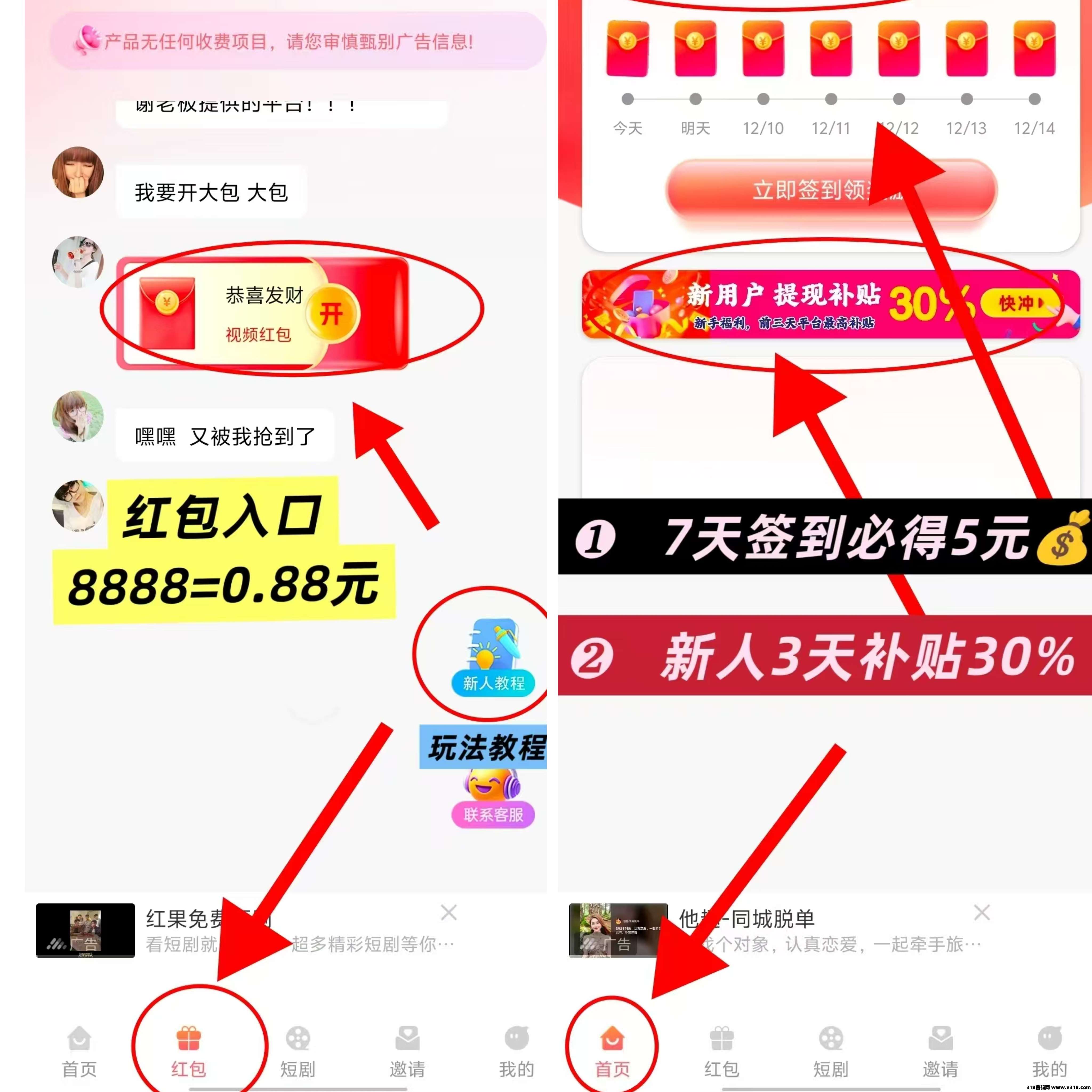 看广告/短剧红包1000-8888金币
