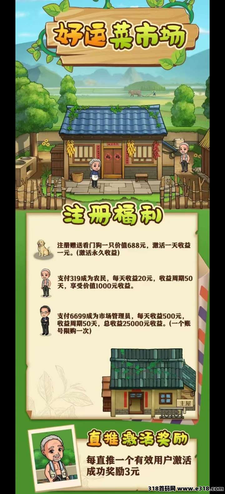 好运菜市场,零撸保底收益高,注册奖励688米,激活后每天收益1米