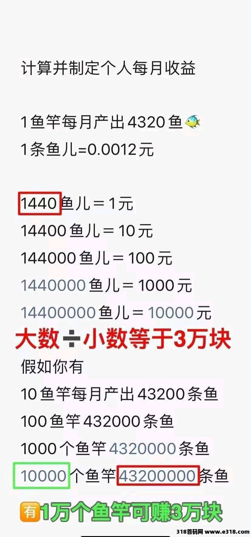10个鱼竿可产生。43200小鱼