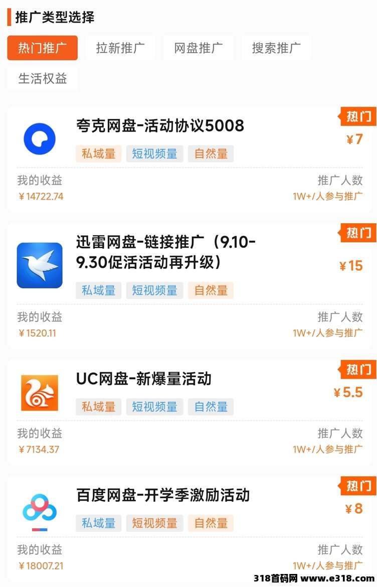 推广价格,显示收益,不同的网盘推广价格不同,只要是当天第一个点击保存你的链接那么转存收益就是你的,拉新就是新用户注册第一个点击你的链接那么你就有拉新收益。