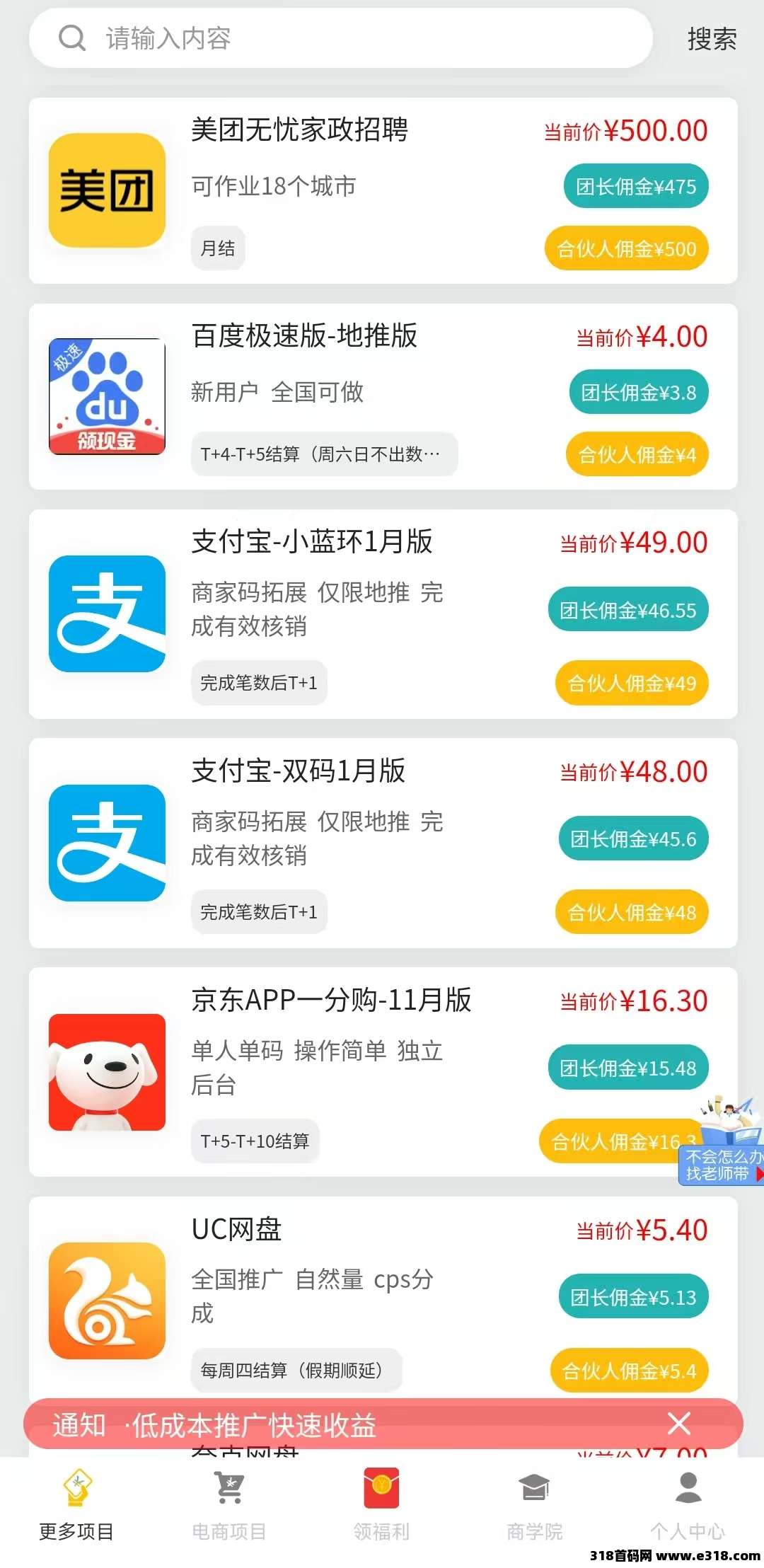 平台内【官方推荐】任务为地推任务,完全免费,推广项目30+种,只需在想要做的项目界面申请推广码就可以,推广任务佣金结算到平台,自行提现,无金额或次数等限制,每日公布各项目结算进度,安全透明。