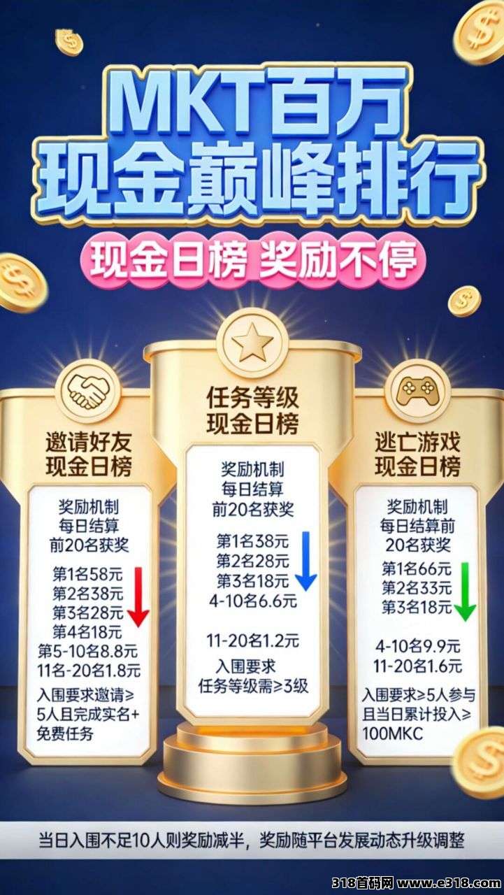 平台简介:『MKT』**模式 + 三大现金排行榜(任务/拉新/逃杀)!