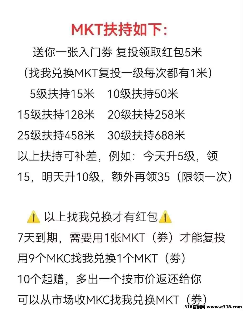 ● 新用户1个MKY开通入场体验任务,每天收益1.5MKC,有效期7天,MKY为免费赠送,可联系他人或_上级免费获取,每人只能开通1次。