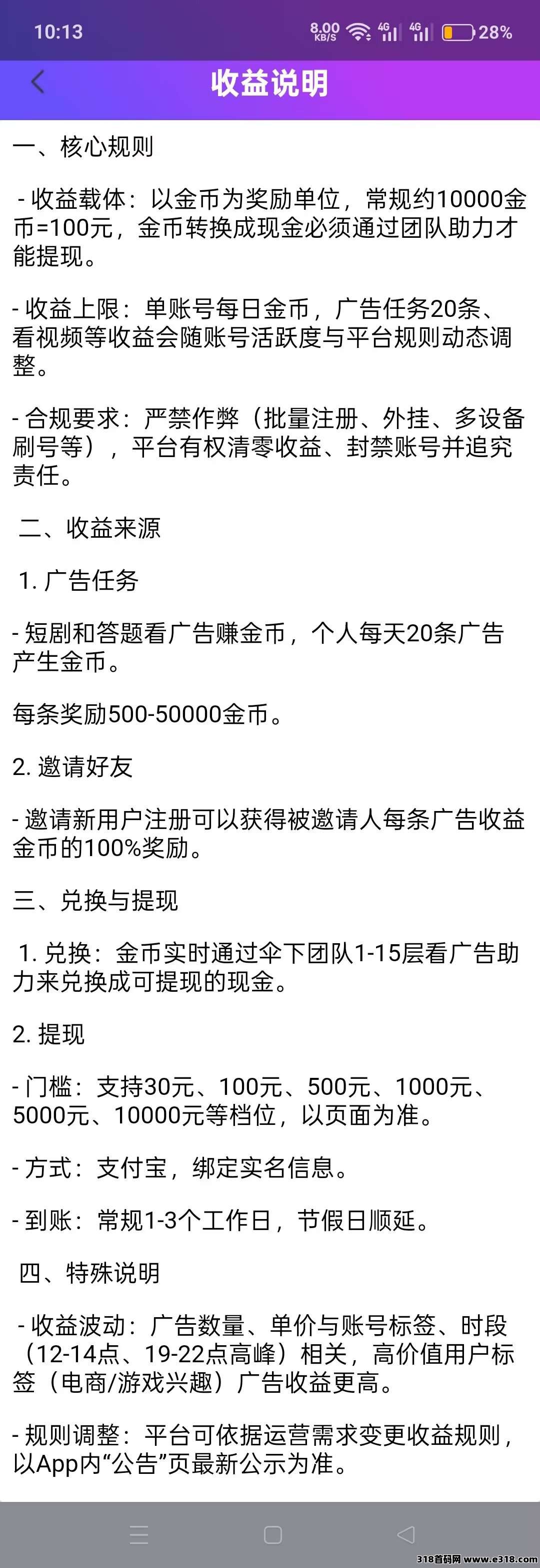 所有用户免费参与,每看一条广告大约15元价值的金币收益,一天最多可以看20条